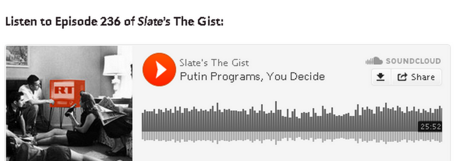 Lukas Alpert used to be a media reporter at The Wall Street Journal so you’d expect him to be fairly accurate on matters of the press. He appeared on Slate’s The Gist podcast with Mike Pesca to promote a mini-book about RT, getting quite a few basic facts about RT wrong. Among those: that RT “almost don’t (sic) cover Russia at all;” that RT coordinates its activities with the Russian Foreign Ministry to prepare news packages supporting FM issues of the day; and that, according to former RT employees, “Foreign Ministry handlers” vet all of RT’s political reporting.